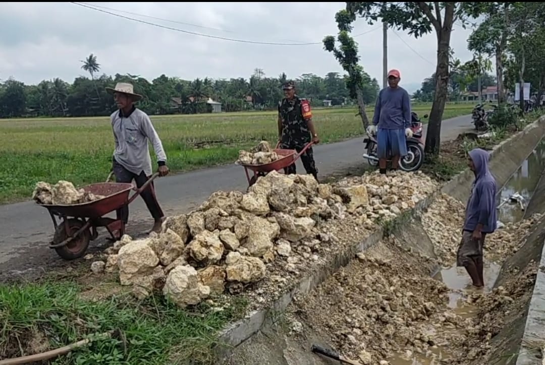 Cilacap – Dukung Ketahanan Pangan yang ada di wilayahnya, Babinsa Koramil 05/Nusawungu Kodim 0703/Cilacap Pelda Sutrisno bersama warga kerja bakti memperbaiki jalan Talud irigasi di Desa Purwadadi, Kecamatan Nusawungu, Kabupaten Cilacap, Sabtu (17/09/2022).