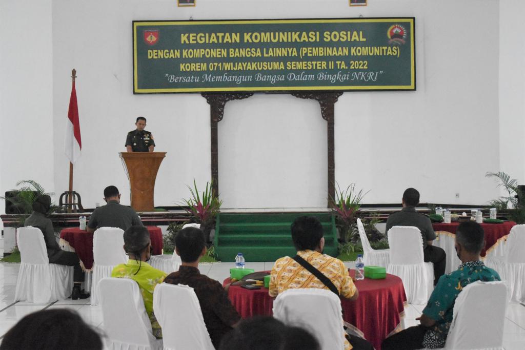 Banyumas – Guna menjalin dan mempererat kebersamaan dan memperkokoh soliditas, Korem 071/Wijayakusuma menggelar Komunikasi Sosial dengan segenap komponen dan elemen masyarakat, Kamis (15/9/2022) di Gedung Pertemuan A. Yani Makorem 071/Wijayakusuma Sokaraja, Banyumas.