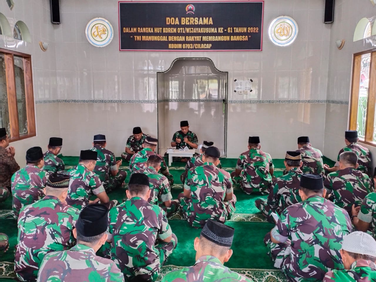 Doa bersama dipimpin Pasipers Kapten Cpm Agus Santoso dan diikuti oleh prajurit dan PNS Kodim 0703/Cilacap. Kegiatan dilaksanakan sebagai wujud ungkapan rasa syukur atas limpahan rahmat dan hidayah-Nya karena hingga sampai detik ini masih diberikan anugerah untuk menjalankan tugas sebagai prajurit dan PNS TNI AD dalam mengabdikan diri kepada bangsa dan negara Indonesia.