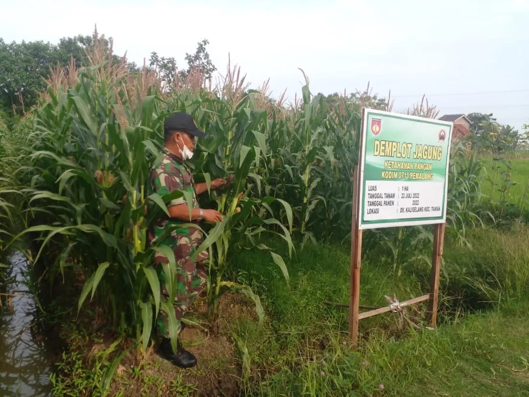 Pemalang – Koptu Rawat merupakan anggota Staf Teritorial Kodim 0711/Pemalang rutin melaksanakan pengawasan dan perawatan tanaman jagung di salah satu lahan Demlot Kodim 0711/Pemalang seluas 1,3 Ha di desa Kaligelang, kecamatan Taman, kabupaten Pemalang.Jumat (07/10/2022).