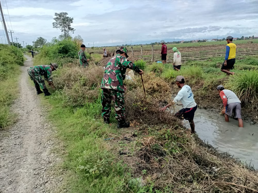 Babinsa dan warga beramai-ramai memperbaiki saluran air secara gotong-royong, sehingga proses renovasi saluran air dapat dilakukan dengan cepat sehingga semakin cepat pula untuk segera digunakan dalam mengairi lahan pertanian yang mana dapat berdampak positif pada peningkatan kesuburan dan hasil panen.