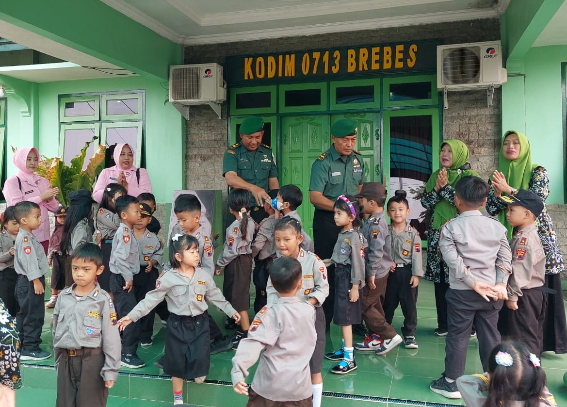Brebes – Puluhan anak-anak TK Kemala Bhayangkari Brebes melaksanakan kunjungan ke Markas Kodim 0713 Brebes Korem 071/Wijayakusuma, Senin (15/01/2024).