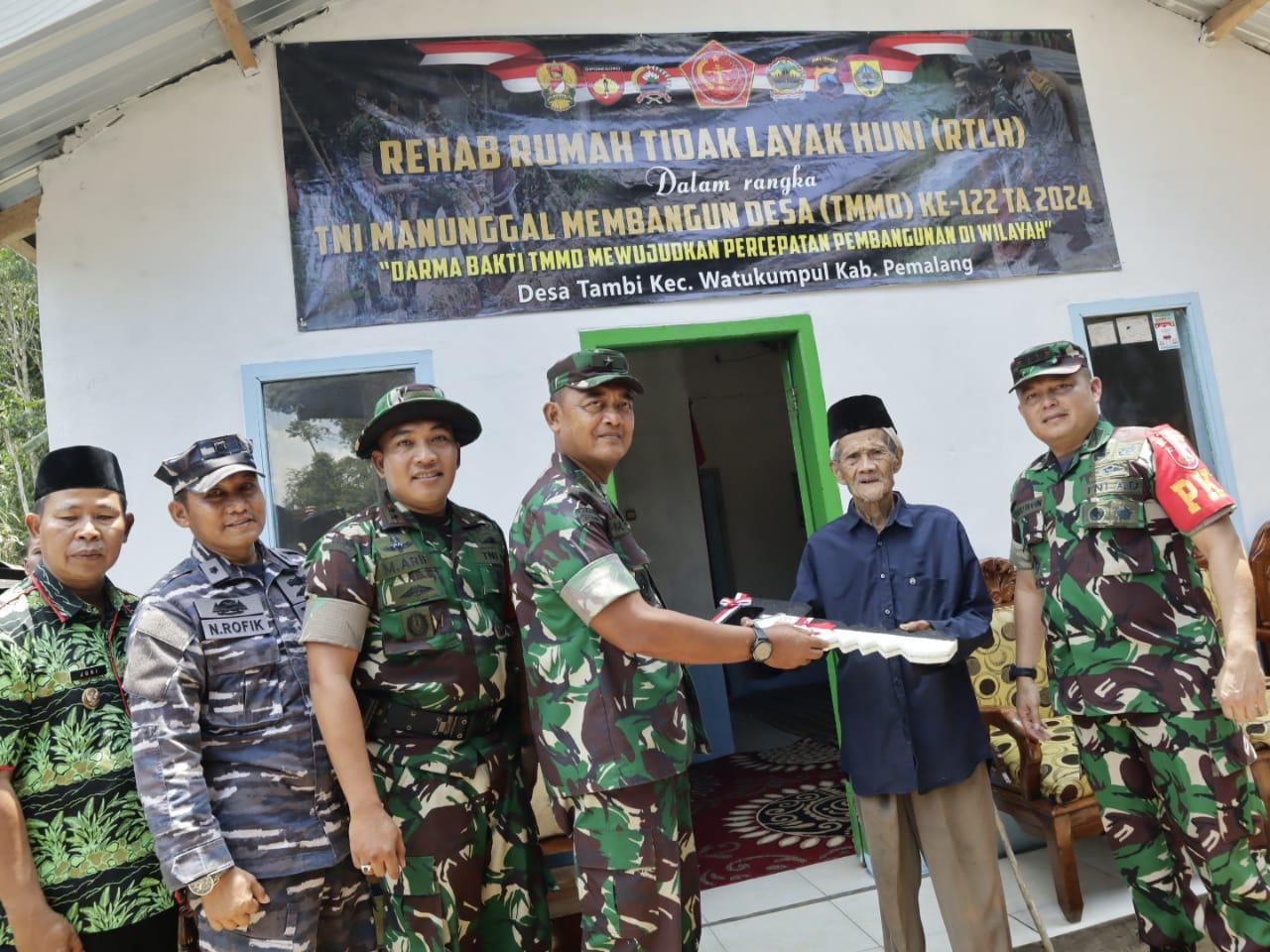 Penyerahan dilakukan di rumah salah satu warga yang mendapatkan bantuan rehab RTLH pada TMMD Reguler ke 122 tahun 2024 Kodim 0711/Pemalang Pak Miyarja (90) RT 05/01 dukuh Jambu Tengah, desa Tambi kecamatan Watukumpul.