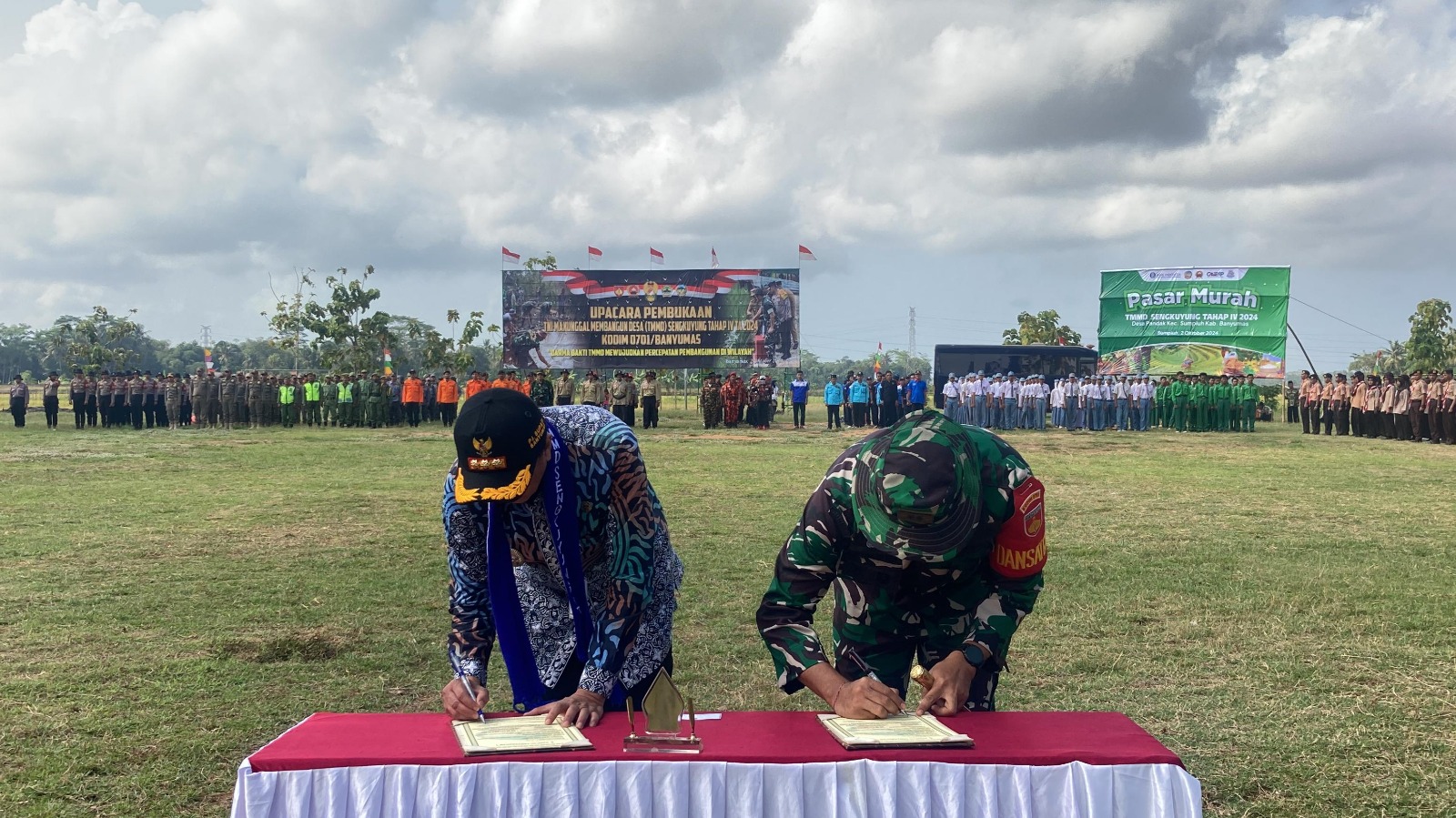 Pembukaan TMMD Sengkuyung Tahap IV ditandai dengan penyerahan alat kerja secara simbolis dan penandatanganan berita serah terima program TMMD Sengkuyung Tahap IV Tahun 2024 Kodim 0701/Banyumas dari PJ Bupati Banyumas Iwanuddin Iskandar, SH., M.Hum kepada Komandan Kodim 0701/Banyumas Letkol Arm Ida Bagus Adi Purnama S.T., M.Han., selaku Komandan Satgas TMMD.