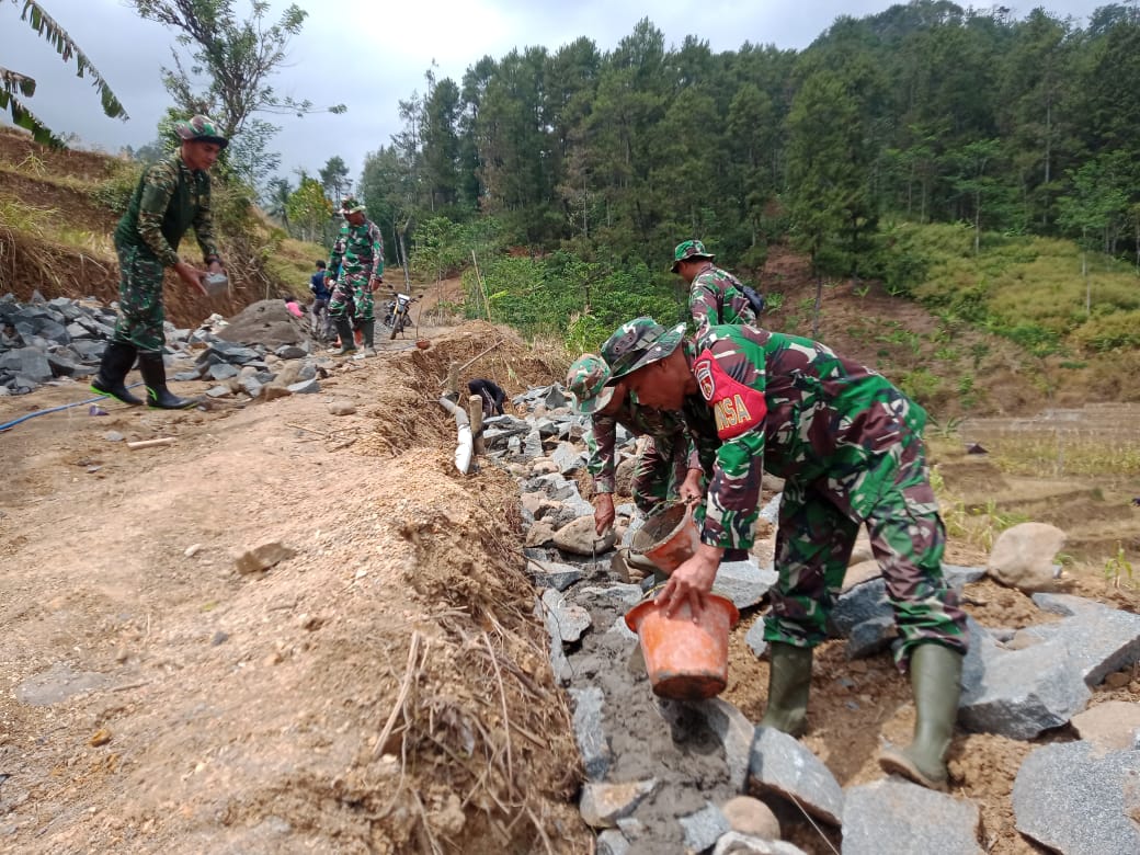 Tampak terlihat segenap anggota Satgas bersama warga langsung berjibaku peralatan yang ada, guna mengerjakan salah satu sasaran fisik yakni pembuatan talud.