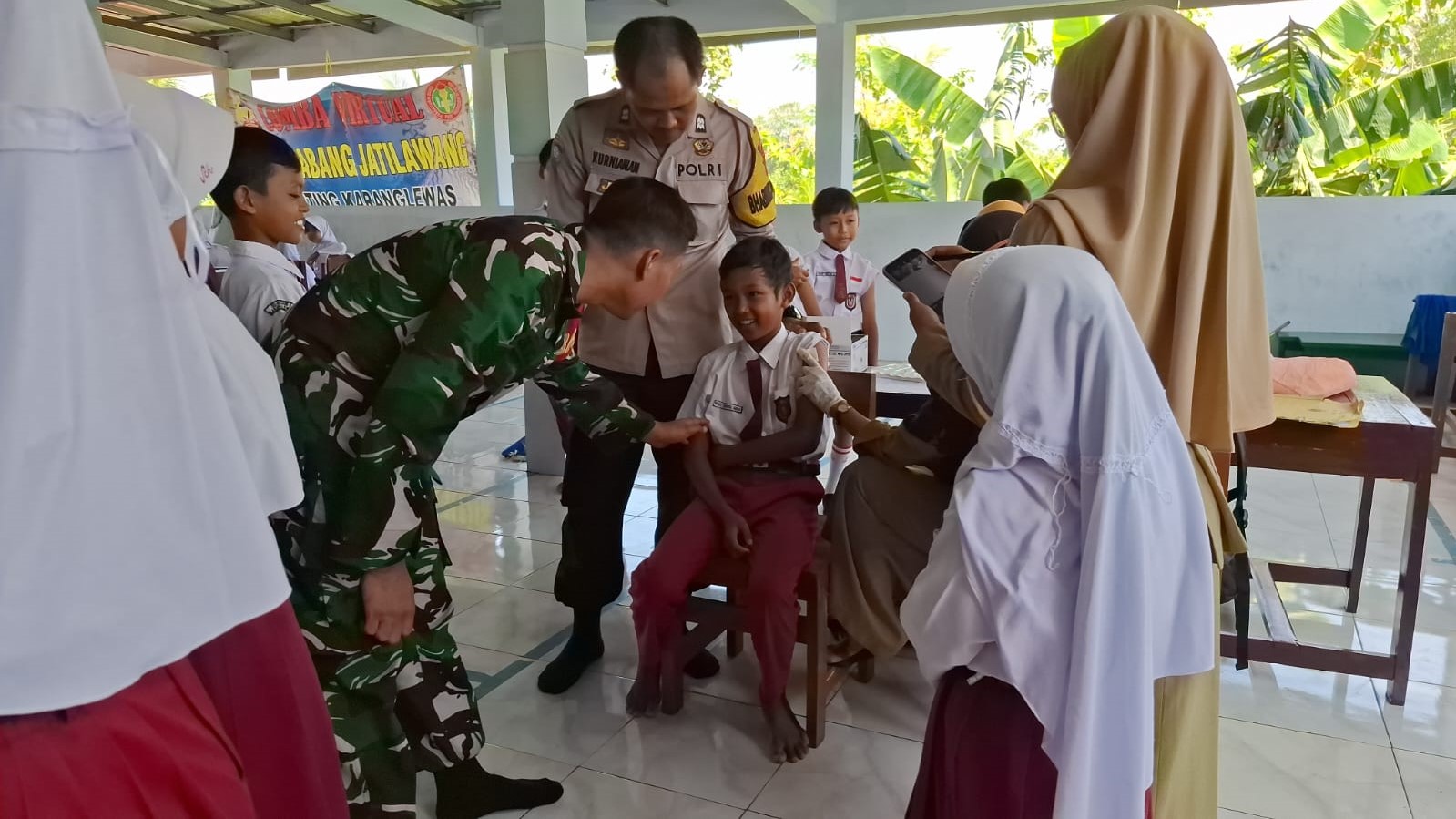 Banyumas – Babinsa Koramil 21/Jatilawang, Kodim 0701/Banyumas, Korem 071/Wijayakusuma, Serka Jamalludin bersama Bhabinkamtibmas melaksanakan pendampingan kegiatan Bulan Imunisasi Anak Sekolah (BIAS) di SD Negeri 1 dan SD Negeri 2 Karanglewas Kec. Jatilawang Kab. Banyumas, Senin (18/11/2024).