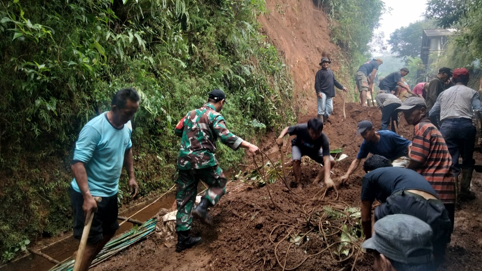 Menanggapi laporan dari warga, Babinsa Koramil 15/Pekuncen bertindak cepat dengan meninjau lokasi dan melakukan pembersihkan material tanah longsor. Dalam proses pembersihan material yang dilakukan, Babinsa beserta warga bekerja tanpa henti untuk membuka kembali akses jalan yang tertutup longsor.