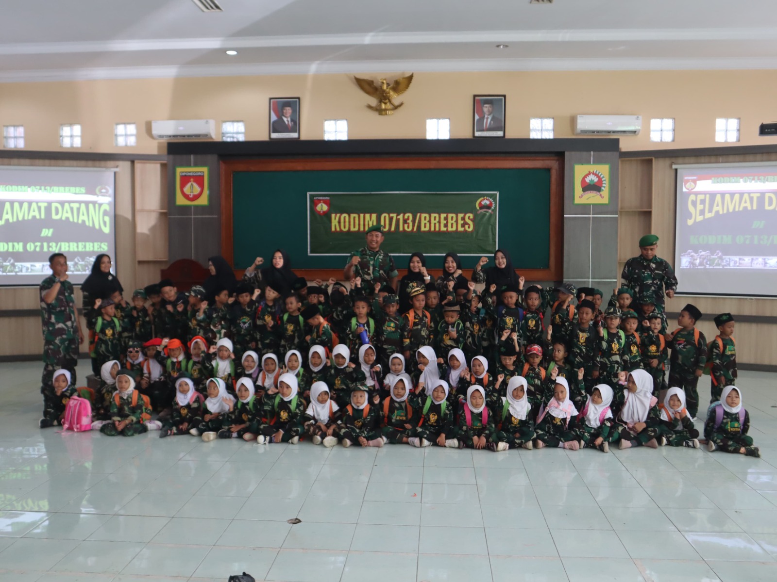 Brebes – Puluhan Peserta Didik Anak–anak RA Al Madinah Dukuh Bugel, Kelurahan Pasarbatang, Kecamatan Brebes, Dengan penuh keceriaan mereka berkunjung ke Kodim 0713/Brebes dan disambut oleh Bati Wanwil Siter Kodim Peltu Agus Ratono beserta anggota staf untuk bermain dan belajar bersama di Aula Jenderal Soedirman 107 Brebes, Jawa Tengah. Kamis (21/11/2024).
