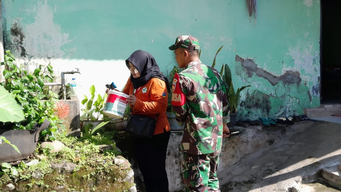 Banyumas – Guna menekan kasus DBD dan memutus mata rantai berkembangbiaknya nyamuk Aedes Aegypti, Babinsa Koramil 25/Purwokerto Selatan Kodim 0701/Banyumas Korem 071/Wijayakusuma Serda Lukas F bersama dengan Bhabinkamtibmas dan Aparat Kelurahan mendampingi Tenaga Kesehatan dalam kegiatan Pemberantasan Sarang Nyamuk (PSN) di Kelurahan Karanglewas Lor, Kecamatan Purwokerto Barat, Kabupaten Banyumas. Senin (16/12/2024).