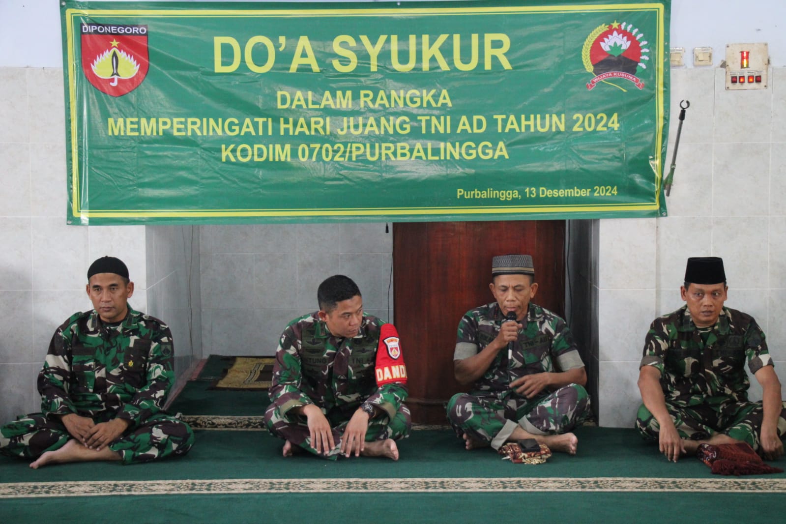 PURBALINGGA – Kodim 0702/Purbalingga menggelar Doa Bersama dalam rangka menyambut Hari Juang TNI AD Ke- 79, di Masjid Baitul Qodim, Jl. Ahmadi, Bancar, Kecamatan Purbalingga, Kabupaten Purbalingga, Jumat (13/12/24).
