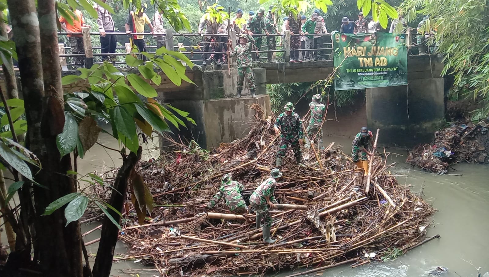Dengan semangat gotong royong, kegiatan yang melibatkan sekitar 100 personel TNI, Polri dan instansi lainnya bersama masyarakat tampak terlihat antusiasme dari peserta membersihkan sampah di sepanjang aliran Sungai Kalibener.