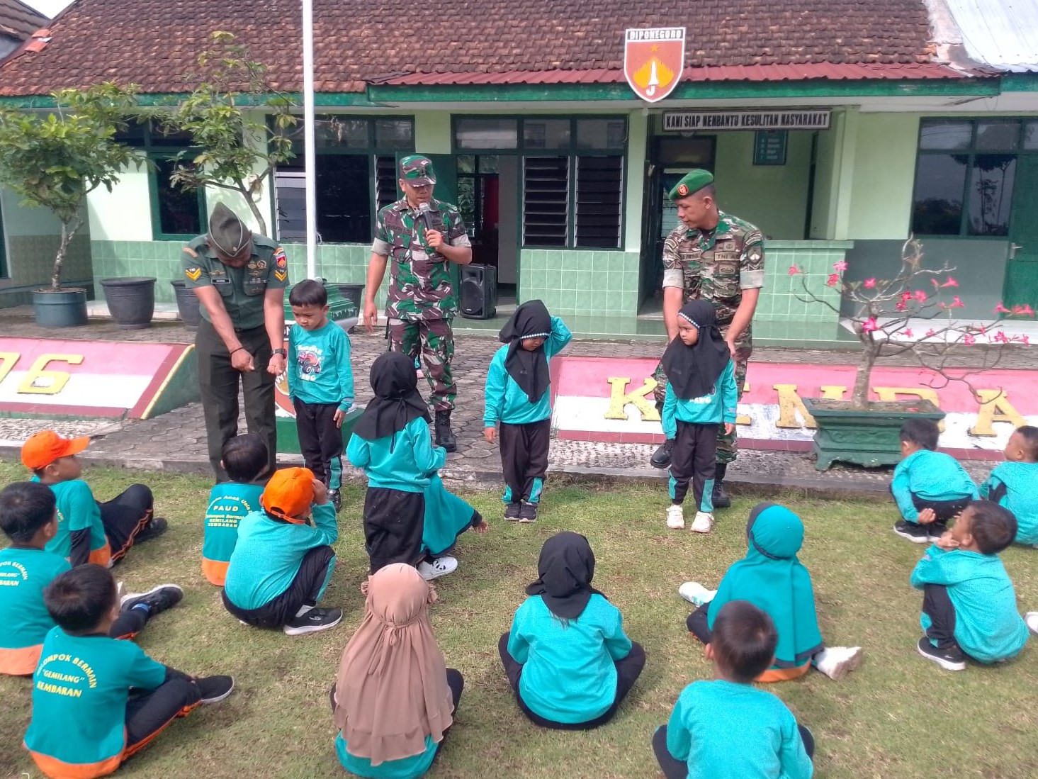 Batituud Peltu Mahfud mewakili Danramil 06/Kembaran Kapten Inf Rasto menyampaikan selamat datang kepada rombongan, Paud KB Gemilang dan mengucapkan terimakasih atas kepercayaan kepada Koramil 06/Kembaran sebagai tempat edukasi kepada anak-anak, semoga kedatangan anak-anak Paud KB Gemilang semakin menambah kecintaan kepada Tentara Nasional Indonesia Angkatan Darat.