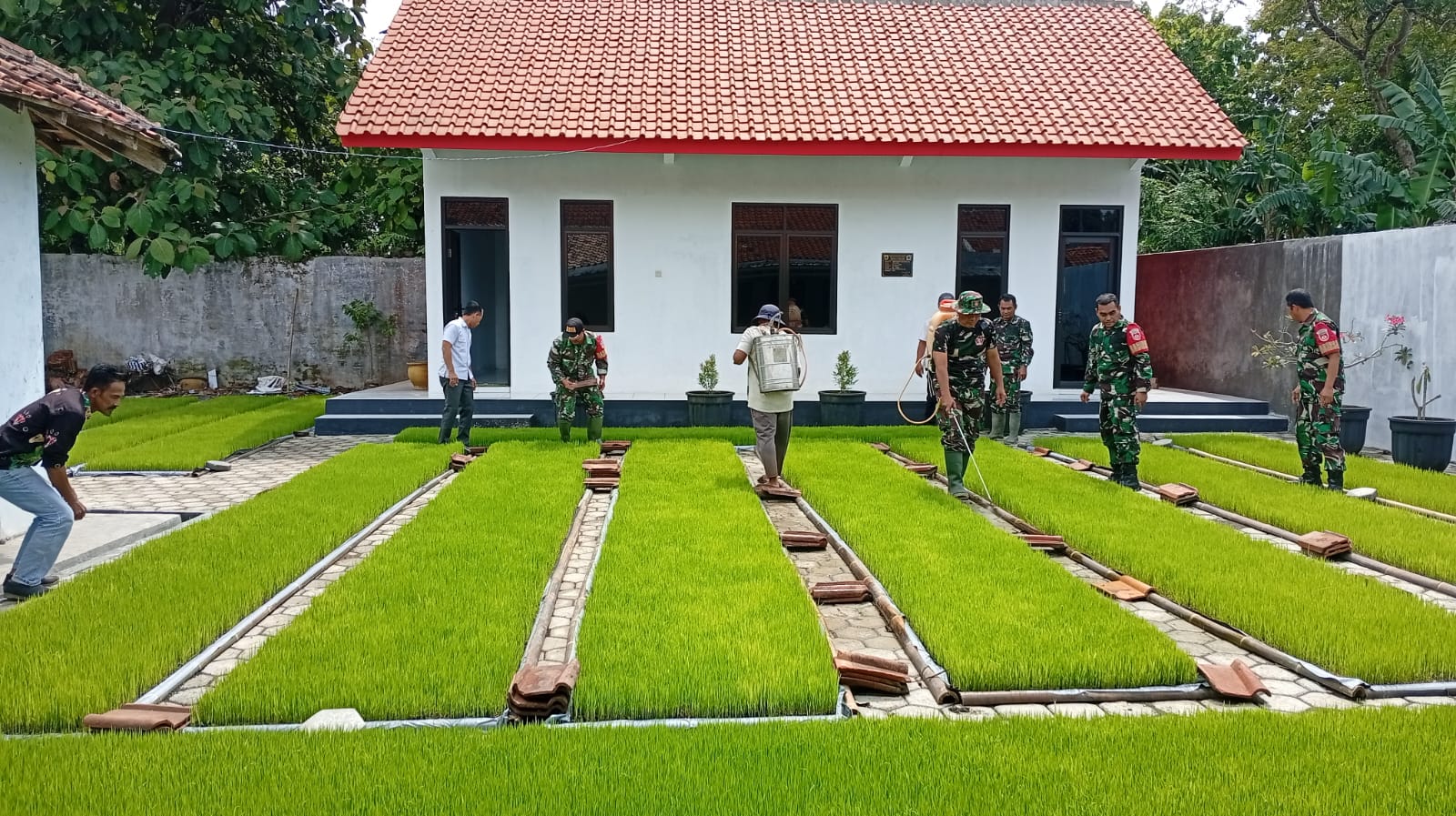 Di halaman balai desa Losari, nampak Serma Mujiyono sedang aktif melakukan pendampingan penyemprotan pupuk vegetatif dan biotonik dilahan penyemaian benih padi sinar mentari milik Kelompok Tani ( Poktan ) Tani Maju Desa Losari .