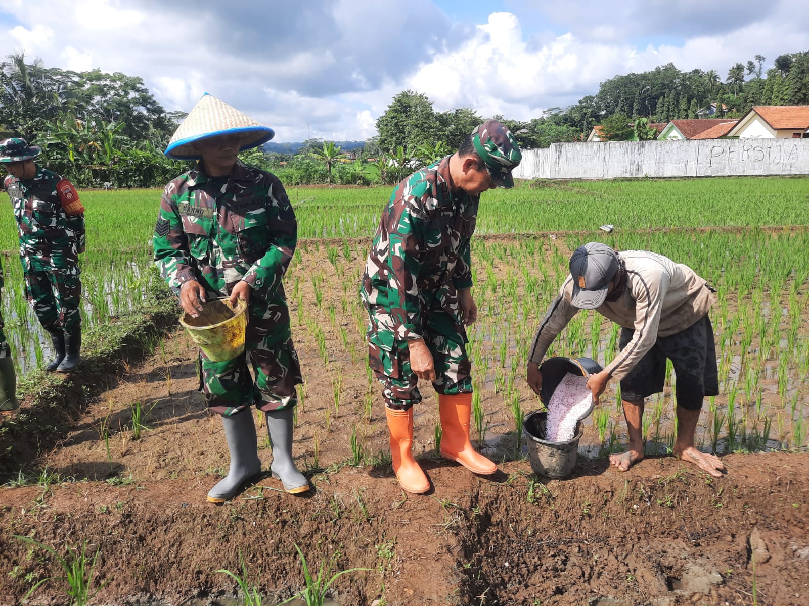Kegiatan pendampingan pemupukan yang dilaksanakan oleh Anggota Koramil 14/Gumelar kepada Kelompok Tani Margodadi yaitu di lahan persawahan milik Bapak Darsito dengan luas lahan ± 200 ubin dan dilaksanakan pemupukan pertama di usia 15 hari tanam.