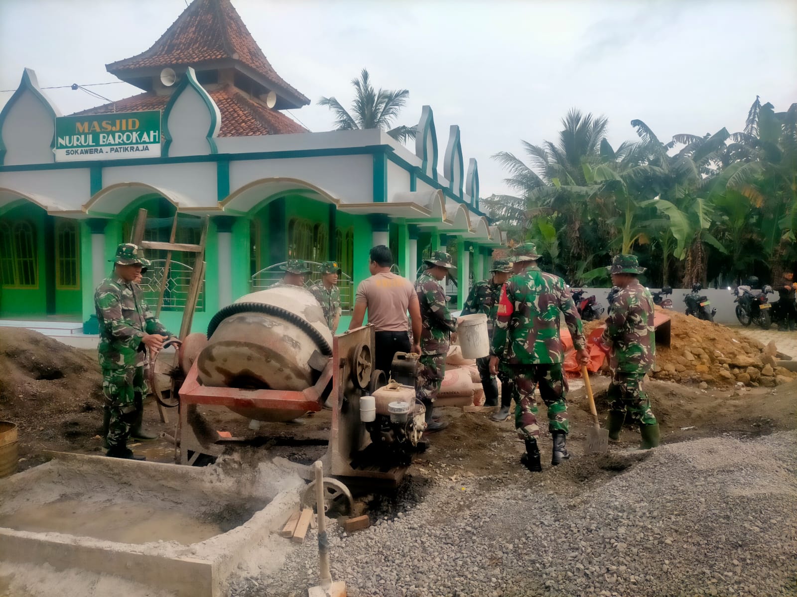 TNI-Polri Bantu Pengecoran Pembangunan TPQ di Desa Sokawera